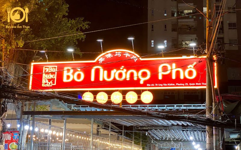 Bò nướng phố là một địa điểm ẩm thực quen thuộc với những tín đồ thịt nướng tại quận Bình Thạnh. Nằm trên đường Ung Văn Khiêm, quán Bò Nướng Phố chi nhánh này thu hút thực khách bởi thực đơn đa dạng các món bò nướng hấp dẫn cùng không gian rộng rãi, thoáng mát.