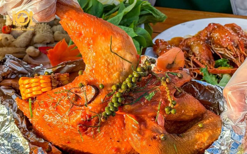 Gà tại đây được chế biến từ loại gà thả đồi, nên sẽ có độ săn chắc và ngọt thịt hơn so với các loại gà công nghiệp. Sau quá trình chọn lọc là công đoạn chế biến kỳ công. Các đầu bếp giàu kinh nghiệm và niềm đam mê với nghề sẽ tẩm ướp thứ nước sốt tiêu xanh “bí truyền”, sau đó bọc trong giấy bạc rồi nướng trên than hồng cho đến khi gà đạt được độ chín vừa phải.