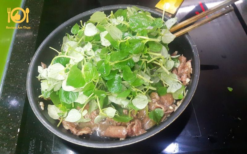 - Xào rau đến khi rau chín tái thì cho thịt bò vào xào chung.