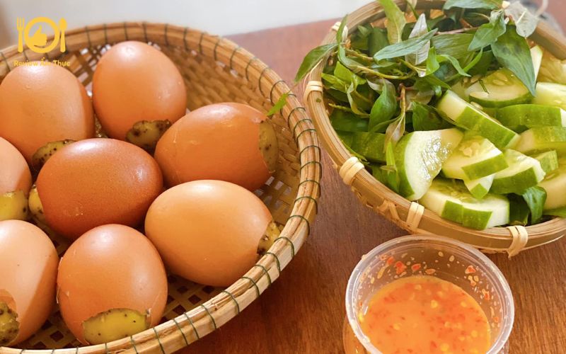 - Trứng gà nướng ngon, giá hạt dẻ, nước chấm số dzách.